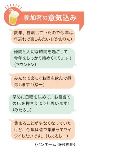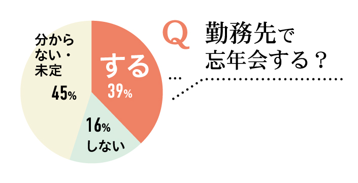 約4割の人が職場での忘年会をすると答えた。今年は団体でする人も増えそう。店の予約は早めがおすすめ。
