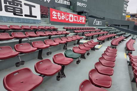 これは2009年、栗原健太選手が球場で初めてホームランを打ったときに、ボールが当たった席。記念に赤から緑に変えられ、「栗原シート」と呼ばれています。