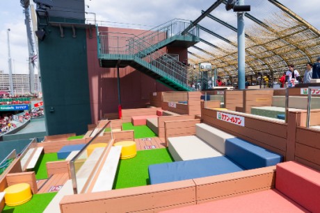 人工芝の上にソファが並んでいて、最大10人までのグループでごろごろしながら野球観戦ができます。まるでリビングみたいにくつろげるよ!
