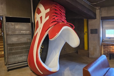 これは、地下にあるアサヒスーパードライスポーツバーにある巨大スパイクで、大きすぎてつま先がスタンドに突き出してしまっているよ。