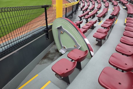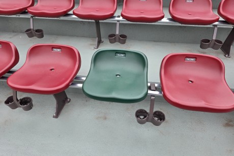 マツダ スタジアムの座席は赤色が基本。でも、レフトスタンドに赤いイスに囲まれて、ポツンと1つだけ緑色のイスがあります。