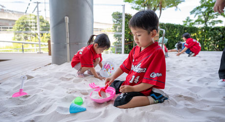 ここはまるでビーチリゾートみたいなエリアで、野球観戦をしながら、バーベキューしたり、砂場で遊んだりできちゃうよ!