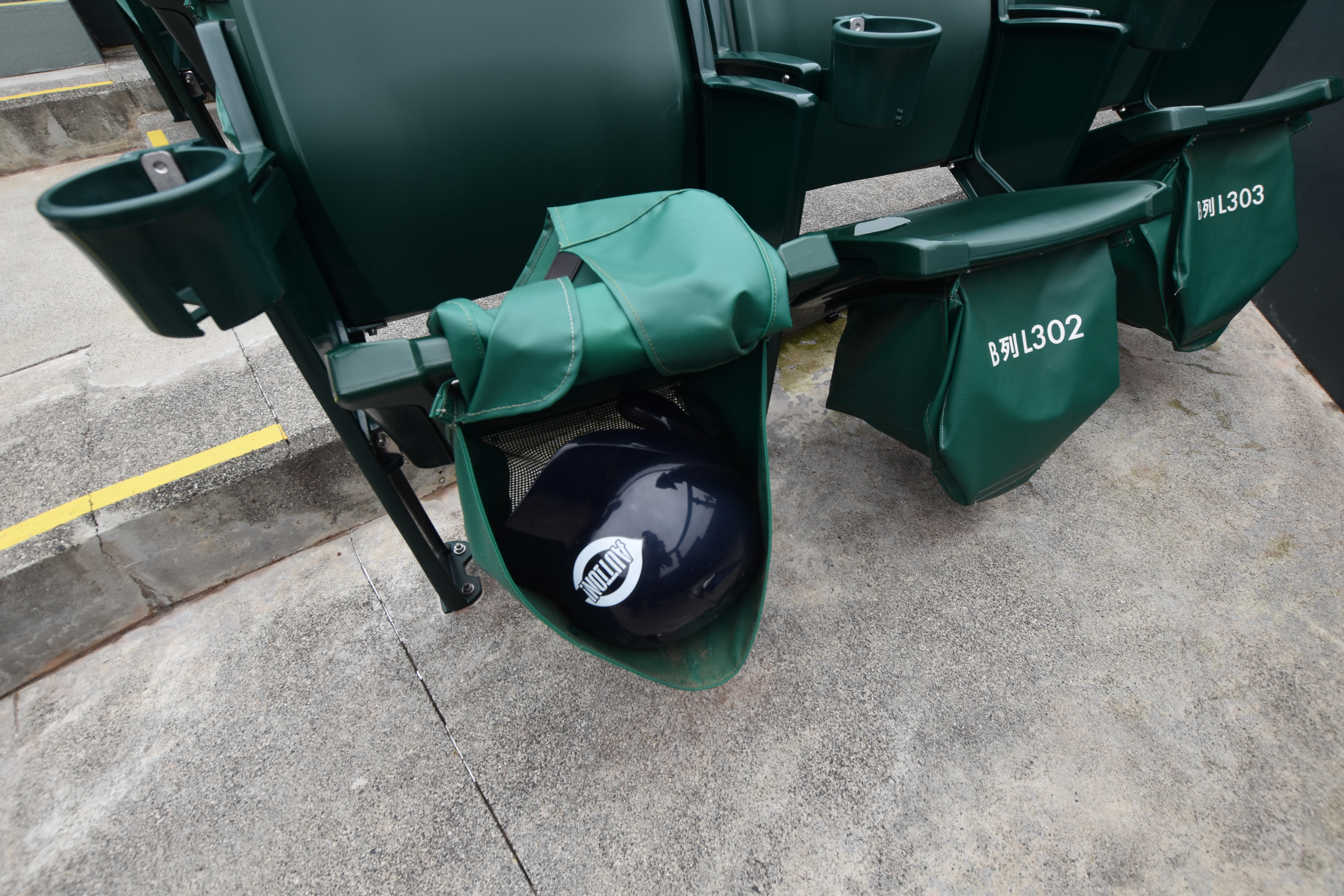 座席の下には、ファウルボールから守ってくれるヘルメットもあるよ!