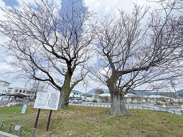 東広島市黒瀬生涯学習センターからスタートします。地点①は黒瀬中央公園で、元々は中黒瀬小の敷地でした。園内には2本のセンダンの巨木(東広島市天然記念物)が並んでいて、明治45(1912)年に中黒瀬小の校舎が完成した際に植えられました。ここには土肥(とひ)元忠翁碑、平賀迅夫(はやお)翁記念碑の2基の石碑があり、どちらの碑文にも、小学校建設に関する記述があります。