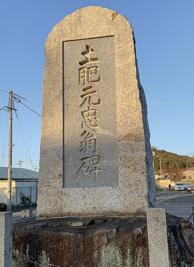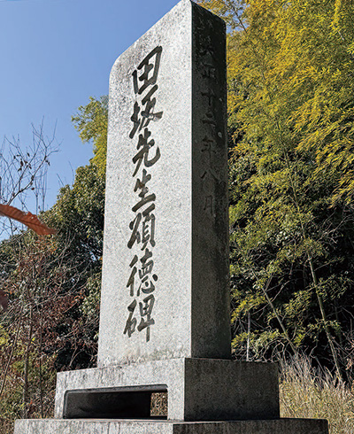 道標がある道の分岐の山側には、大正12(1923)年建立の田坂先生頌徳碑があります。碑文によると、本名である田坂九一郎は、安政元(1854)年に生まれ、生家にあった私塾〝栖霞楼(せいかろう)塾″や広島師範学校(現広島大学教育学部)で学び、その後、天神小・中黒瀬小の訓導・校長を勤めます。つまり、九一郎は、統合前後の小学校の教員や校長だったのです。また、碑の礎石には、発起人として土肥元忠、平賀九万三の名前もあります。