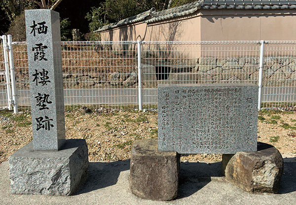 少し進んだ地点③には、栖霞楼塾跡の碑があります。説明文の石碑には、九一郎の父田坂乙人が、豊前国(福岡県)の学僧の桂林悟澄(けいりんごちょう)を招き、栖霞楼塾を設立したと書かれています。