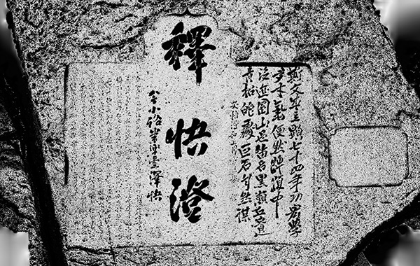 地点③から山際の野道を進みます。この細い野道も西条と広を結ぶ街道でした。この道から分岐する龍王山への道を上がります。わかりにくいのですが、山道から外れたところに、花こう岩の岩盤を削って作った悟澄を顕彰した碑があります(地点④)。文章を考え、字を書いたのは、広の長浜生まれの僧侶宇都宮黙霖(うつのみやもくりん)です。黙霖は、幕末に尊王倒幕思想を確立して全国を巡り、吉田松陰にも影響を与えたとされる人物です。悟澄は、黒瀬に来る前、長浜にあった私塾(石泉塾)に滞在しており、その縁もあって黙霖が碑文を書いたのでしょう。