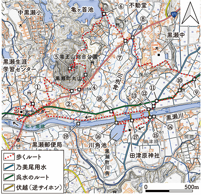 今回は、黒瀬盆地中央部、黒瀬町丸山・乃美尾(のみのお)・川角(かわすみ)を歩きます(図1)。黒瀬盆地の特徴は、黒瀬川沿いの低地だけでなく、小高い丘陵地の両方が見られることです。