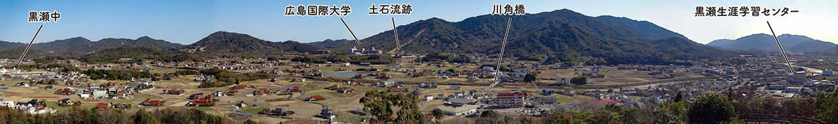 龍王山の頂上(地点⑤)まで上ります。見晴らしの良い場所で、黒瀬盆地を一望できます(図2)。賀茂台地で広く見られる赤瓦の屋根をもつ伝統的な家屋が見えます。少し見えにくいのですが、手前の黒瀬川は、直線で下流の方では蛇行しています。正面には、丘陵地に立地する広島国際大学が見えます。黒瀬では大学や住宅団地が数多く立地しているのは、耕地に不向きな丘陵地が広がっていたことが一因です。