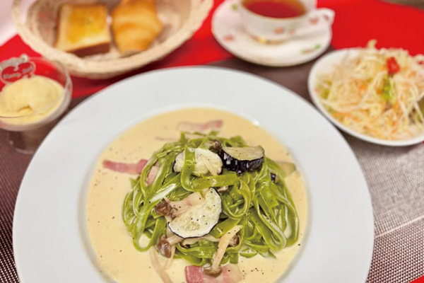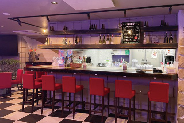 ライブがない日でもパスタなどのランチを提供。ネオンやステージのある店内でする食事も、非日常を感じる。2月には婚活イベントの会場としても使用される。