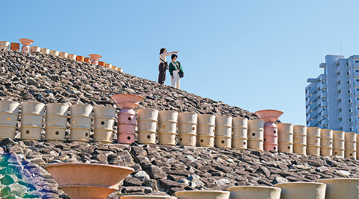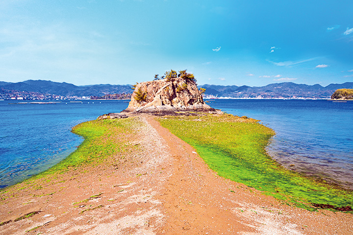 晴天に恵まれた日は、干潮を狙って安芸津町大芝島に行ってみては。沖の小島に続く砂浜の小道が現れる場所があります。フランスの世界遺産を思わせることから「モンサンミシェル」と親しまれています。この写真の日は、砂浜が鮮やかなアオサで縁取られ、視界のはるかかなたまで三津湾と青空が広がっていました。また、付近では約1億年前の地層、市指定天然記念物「大芝の褶曲(しゅうきょく)した地層」を見ることもできます。(フォトリポーター 井川良成)