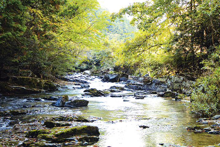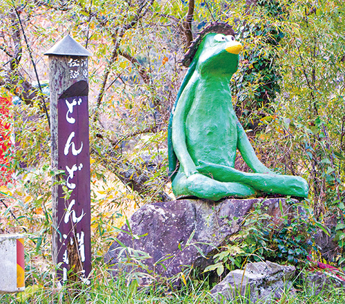 椋梨川にある渓谷「どんどん淵峡」。「どんどん」という名前は、かつて近くの滝城が落城した際、淵に落ちた太鼓の音が響き渡ったという悲しい伝説に由来します。また、カッパ伝説も残っており、周辺にはカッパの像が数多く設置されています。梅雨時期にはアジサイが美しく咲きます。
