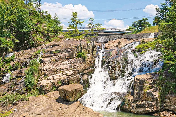 西条のまちなかにある吾妻子の滝。落差は約15㍍で、迫力があります。岩肌を滑り落ちる水流と、周囲の木々に癒やされます。