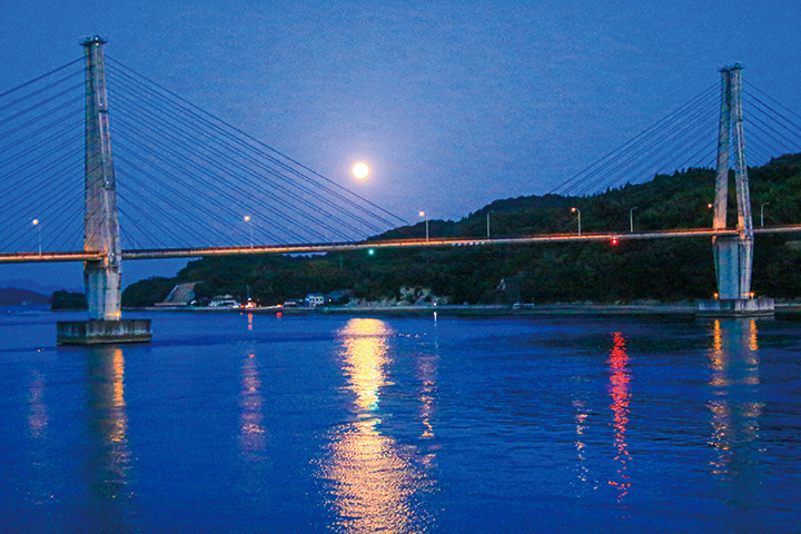 大芝島との間に架けられた大芝大橋。昼は、大芝島を背景に、白い姿が青い空と海に映え、瀬戸内の島々を一望できます。一方で満月の夜には大変身。橋の下から顔を出した月は、橋桁を越えながらゆっくりと大芝島に近づきます。月の黄色、空と海の青、赤い明かりが加わるので、昼とは異なる絶景が現れます。(フォトリポーター 船越雄治)