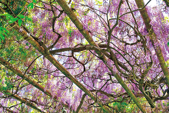 呉市の水道水源として作られたダムの貯水池。貯水池周辺には桜や藤が植えられており、開花時期のみ無料開放されます。約330㍍にもわたる藤棚は、例年4月下旬~5月上旬に紫やピンクの花が咲き、訪れる人々を楽しませます。今年の開放期間は4月19日~5月6日。