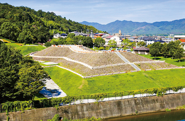 前方後円墳の麓から階段を上り切ると、その雄大さを感じます。古墳を囲むように並べられた埴輪(はにわ)は、鶏や馬、甲冑(かっちゅう)など多種多様。お気に入りを探してみるのも楽しい。周囲は公園として整備されており、子どもが遊んだり、大人が散歩をしたりと憩いの場にもなっています。