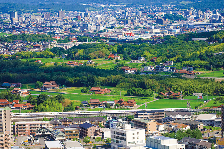 西条町下三永の福成寺へ向かう車道の途中から、西条盆地を一望できます。木立の間から北を向くと、新幹線、赤瓦が点在する田園地帯、商業施設、マンション群が見えます。発展を続ける東広島市を象徴するような風景です。(フォトリポーター 船越雄治)