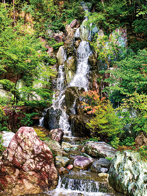 全国の銘石・奇石・組石と季節の花樹を回廊しながら鑑賞できる大規模な石庭「仙石庭園」。数多くある見どころの一つが、人工大滝「仙神大滝」です。多彩な色石で構成され、高さは15㍍。水に濡れて色鮮やかな石や、流れ落ちる水を間近で鑑賞できます。