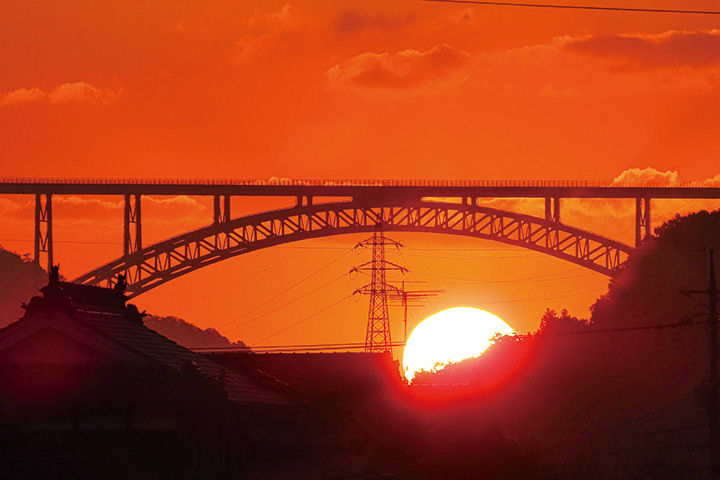 河内町中河内から見える広島空港大橋。沼田川渓谷をまたぐ日本一大きなアーチ橋です。そこに太陽が東の空を照らしながら現れました。谷底からの日の出が見られるのは年に数回です。