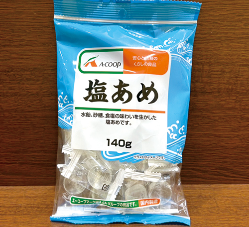 暑い日の塩分補給にぴったり。甘さの中にほどよい塩味がある。原材料は水あめ・砂糖・食塩のみという昔ながらのキャンディ。