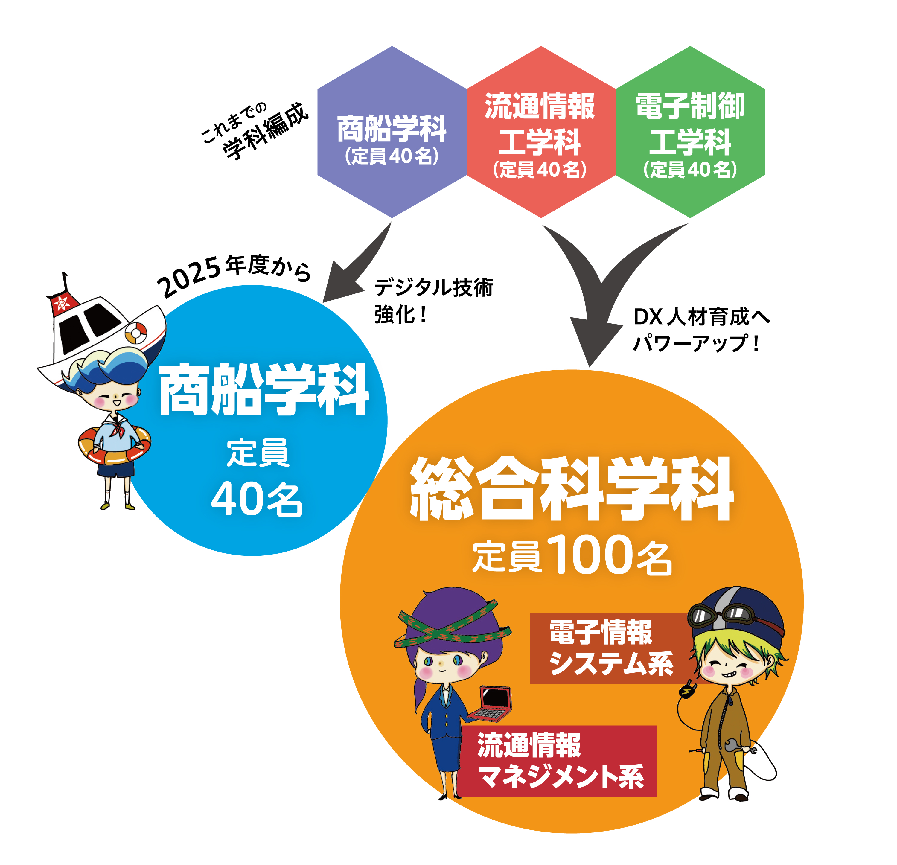 海事産業や製造業、流通業界で活躍する人材を多く輩出している同校。これまでの電子制御工学科と流通情報工学科を一つにして総合科学科とし、AI(人工知能)やビッグデータなどを活用して、地域課題の解決やこれからの社会を支える新技術の開発ができる力を身に付けていく。商船学科でもDX社会に対応した学習も取り入れていく。