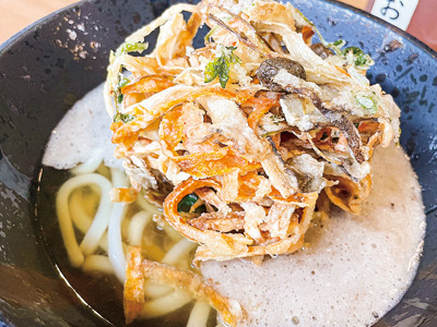 美肌の湯として知られる湯野温泉街にある自然薯(じねんじょ)専門店。香りと粘り気が強い自然薯のとろろをかけて味わうむかごのかき揚げうどんは店自慢の一品。チーズケーキやシフォンケーキなど、自然薯を使ったスイーツも楽しめる。