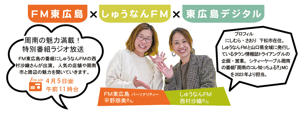 FM東広島としゅうなんFMのコラボ企画! しゅうなんFMの西村沙織さんがイチオシの山口県周南市と周辺の店や施設を、FM東広島パーソナリティー平野朋美さんが訪問。紹介したグルメが当たるプレゼントも!