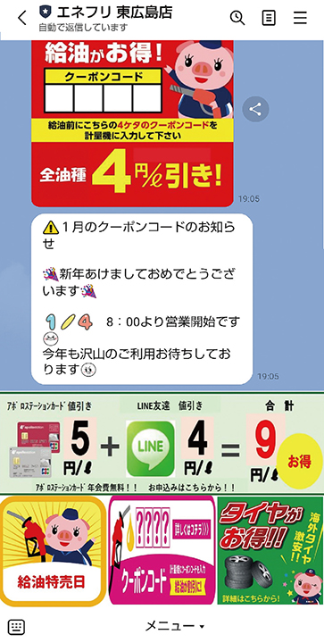 お得に何回でも給油ができるクーポンが毎月もらえる「エネフリ 東広島店」