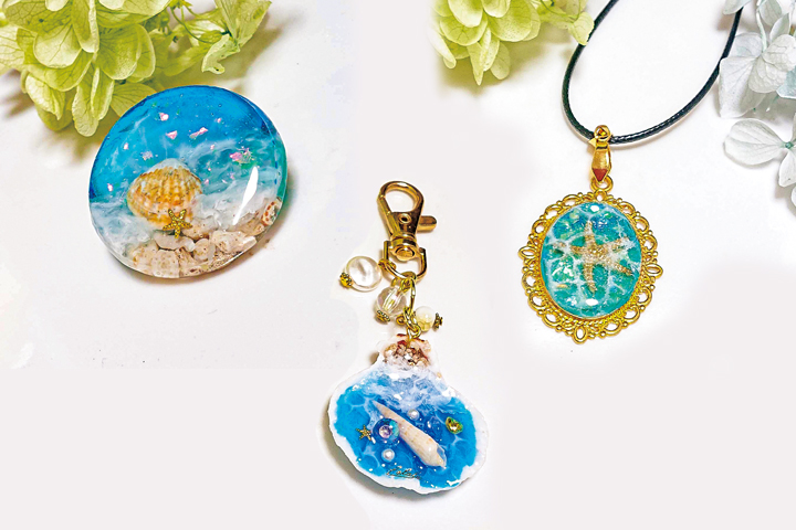 ヒトデや貝殻のモチーフをあしらい、海のきらめきをそのまま閉じ込めたようなデザイン。ハンドメイドで一点物のレジンアクセサリー。