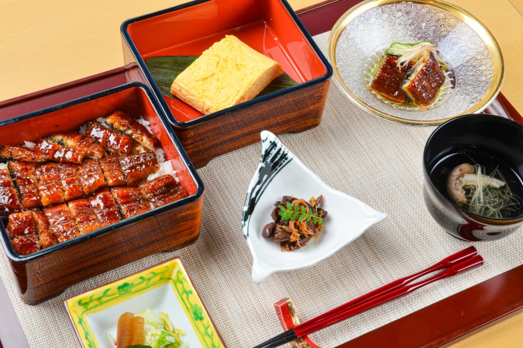 東広島市西条岡町にある「憩いの料亭 白竜湖」では、「うな重」を提供しています。ふっくらと焼き上げた柔らかいうなぎと出汁香る厚焼き玉子が楽しめる重箱です。小鉢やお吸い物などがセット。