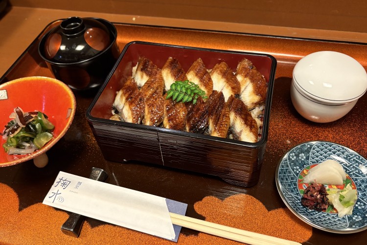 東広島市西条栄町にある割烹「掬水-KIKUSUI-」では、平日の昼限定で「うな重御膳」を提供しています。うな重は、活〆した新鮮な国産のうなぎを使用。自家製のタレで焼き上げています。この他、小鉢、茶わん蒸し、味噌汁、香の物、デザートがついた満足感のある御膳。前日までの予約が必要です。