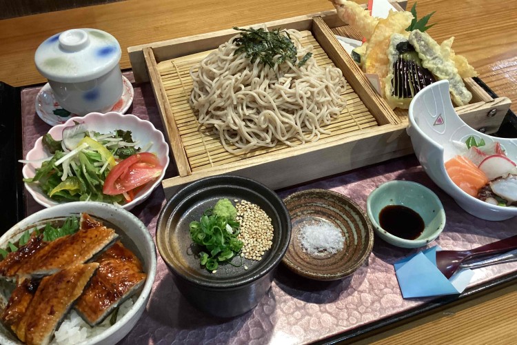 東広島市高屋町杵原にある「和食とてっぱんDining奏-KANADE-」では、「夏の贅沢御膳」を昼の限定で提供しています。ミニうな丼、サラダ、茶わん蒸し、天ざるそば、ミニお造りがセット。夜は、2名様からの要予約。