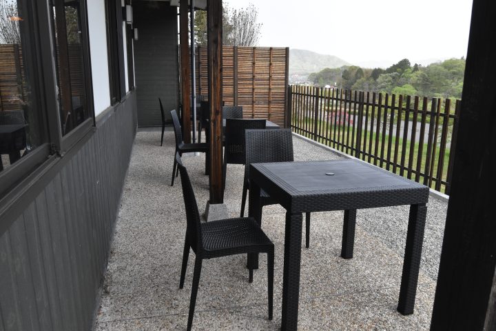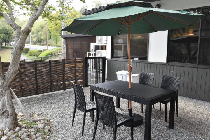 鏡山公園を望むことができるテラス席は、ペット連れの方でも気軽に利用してもらいたいという思いで設置。