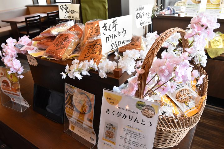 店内では、きく芋かりんとう、辛辛つけ麺(2食入り)、豚骨醤油広島ラーメン(2食入り)などの商品も販売しています。
